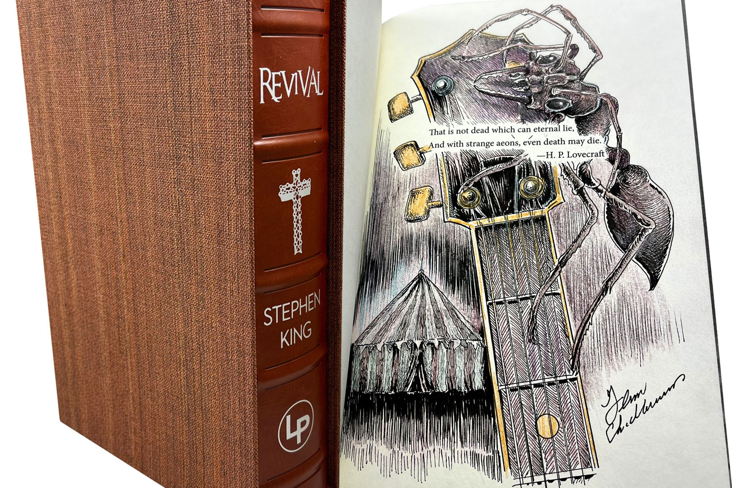 LetterPress Publications 2019. Stephen King “Revival”. Deluxe oversized signed artist edition of only 1,500 produced. Custom-made slipcase wrapped with a woven cloth and stamped with hot foil on the spine. Extremely collectible print run that will be a tiny fraction of the print run of the original trade hardcover edition from Scribner.Â